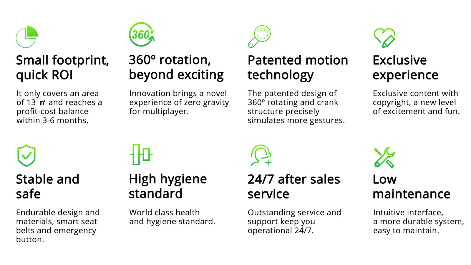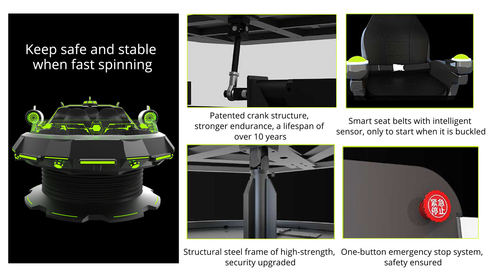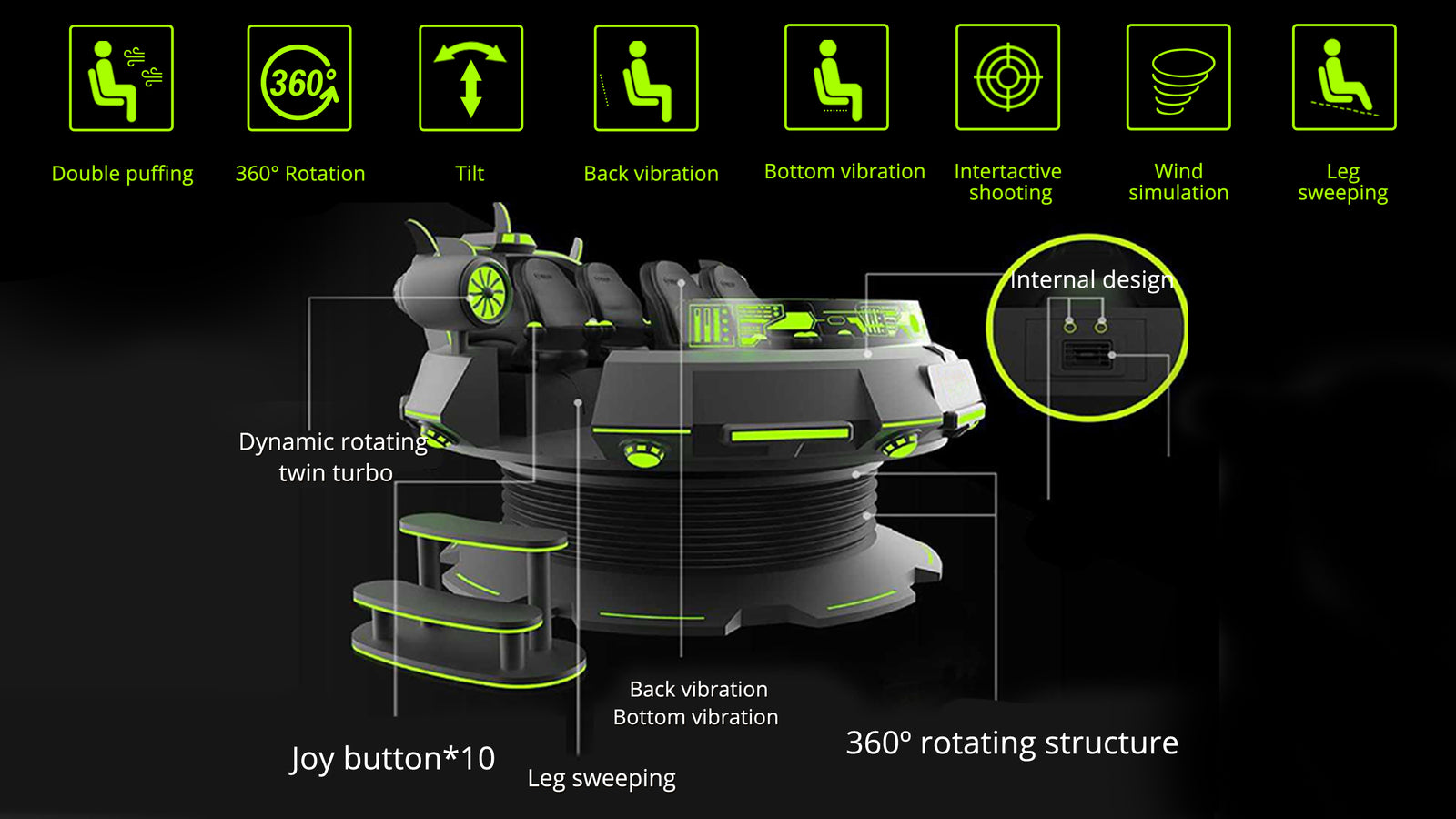 With the 360-degree rotating and patented crank structure, it provides an exclusive gaming experience empowered by the novelty of VR motion system with cutting-edge motion base technology.